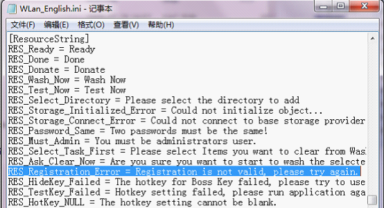(3)由于该程序支持多国语言,来到安装目录下发现一个名为WLan_English.ini的文件,打开得知这是英文显示语言包,尝试在该文件中搜索注册失败信息,结果如下图