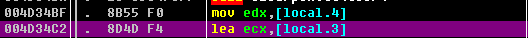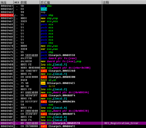 注:当类似mov edx,[local.4]这种看不懂的代码时,在反汇编窗口中点击鼠标右键,选择“分析”,最后选择“从模块中删除分析”就可以转换成熟知的代码了