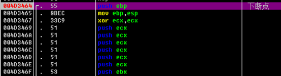 (6)为了简单,一般会在这个函数的头部下断点来进行调试,根据OD中函数头部的提示,函数头部在004D3464处,按F2下断点,然后进行动态调试