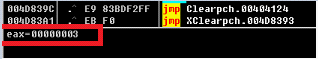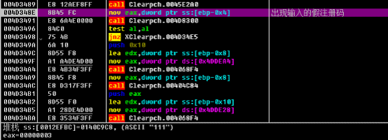 3 在注释窗口或者寄存器窗口中可以看到eax中的值是十六进制的3,转成十进制也是3, 正好是我们输入假注册码的位数,通过下面的跳转发现这里判断输入的注册码是不是9位,如果是的话就继续注册,如果不是则跳转到下面,然后通过retn跳出子程序
