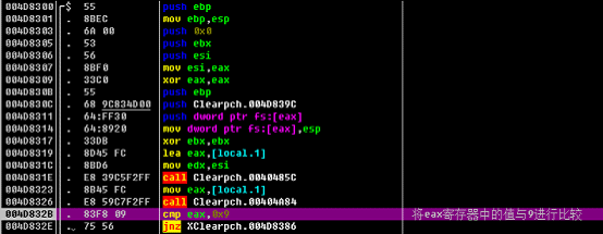 2 来到004D8300后进行F8单步调试,当程序运行到004D832B时出现了一个cmp指令进行比较,然后一个jne跳转,一般遇到这样的比较,后面接跳转的地方要特别注意,因为这很有可能是和注册算法有关的地方