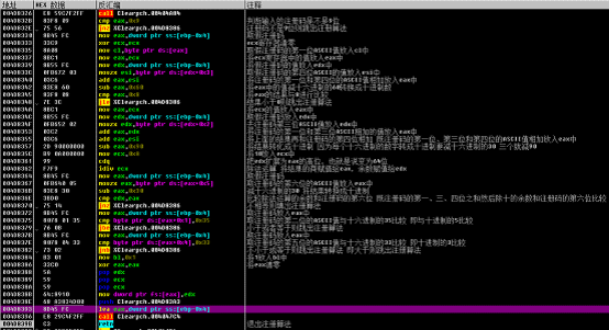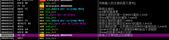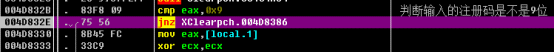 4 按ctrl + F2重新载入程序进行调试,这次输入9位数的注册码。当再次运行到004D832B时,由于eax的值是9则相等,ZF标志位为1,jne跳转没有实现,则继续执行注册算法