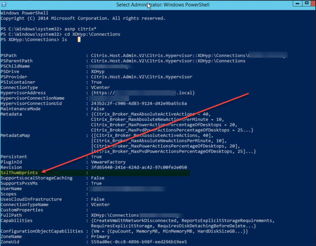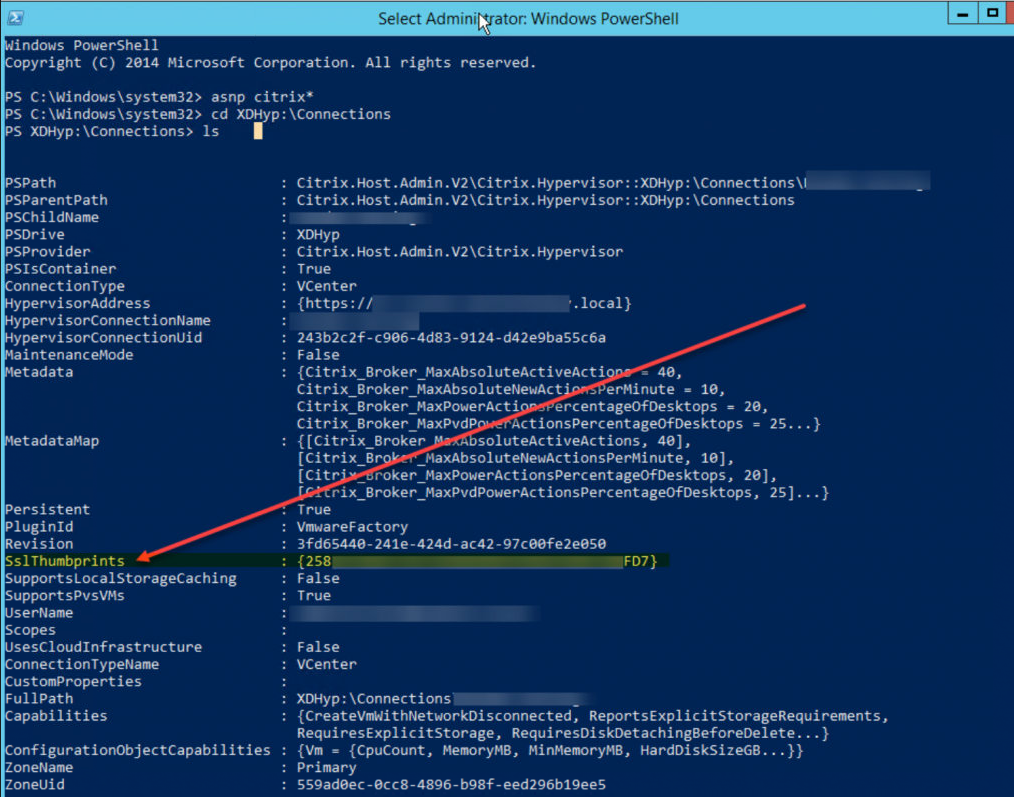 打开一个管理POSH 控制台 ,将Citrix模块(asnp citrix *)和cd加载到XDHyp:/ Connections并运行ls。检查SSLThumbprints条目。