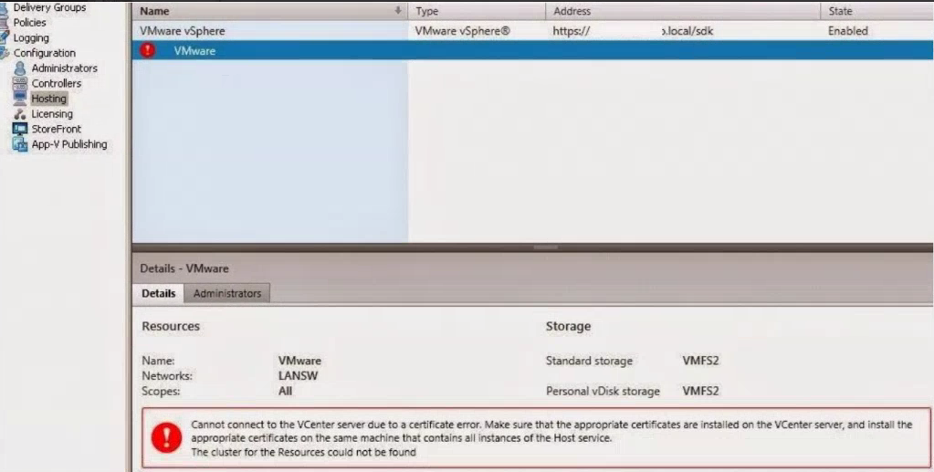 在现有的主机连接或计算机目录上将显示一个错误,指出:“由于证书错误,无法连接到vCenter Server。确保在VCenter服务器上安装了适当的证书,并在站点中的每个控制器上安装了适当的证书。”