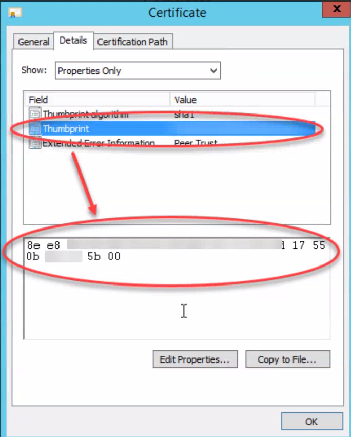 如果为空(或错误的值),如上例所示,请打开导入的证书,将Thumbprint值复制并粘贴到任何texteditor中,删除所有空格并将字符串转换为UPPERCASE。