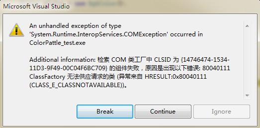 代码 不会出错,但在运行后就会出现异常: Additional information: 检索 COM 类工厂中 CLSID 为 {14746474-1534-11D3-9F49-00C04F6BC709} 的组件失败,原因是出现以下错误: 80040111 ClassFactory 无法供应请求的类 (异常来自 HRESULT:0x80040111 (CLASS_E_CLASSNOTAVAILABLE))(如下图)。