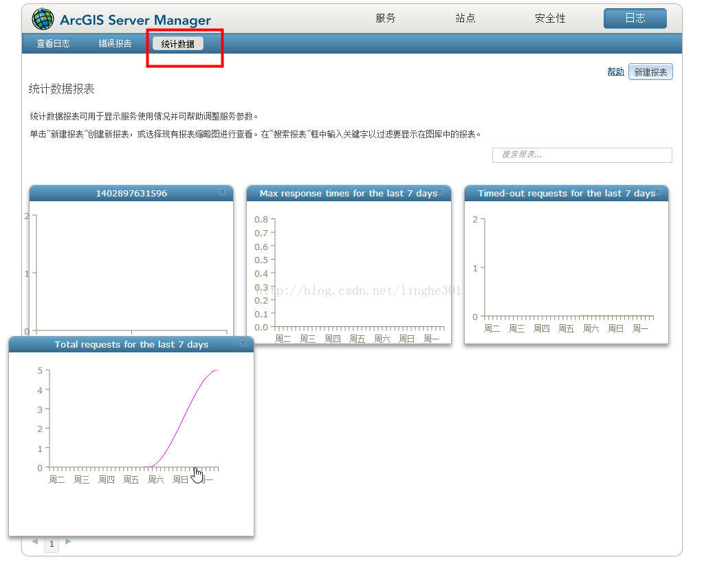 ArcGIS Server记录了种类繁多的服务统计信息,比如总请求数,平均响应时间,超时等,ArcGIS Server管理器会将这些信息以图形曲线的方式报告给用户,ArcGIS Server管理员和服务发布人员可以根据这些信息来监控服务活动,更好的了解客户端是怎么使用这些服务的。