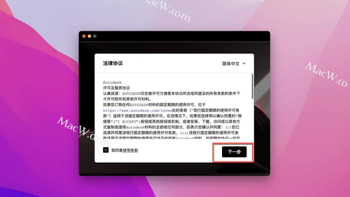 勾选我同意AutoCAD 2024使用条款,然后点击【下一步】。