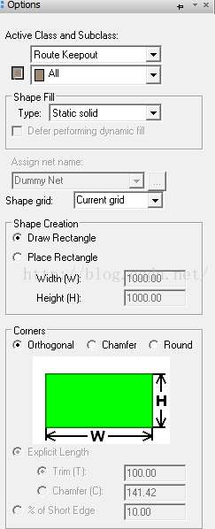 方法一、单击Shape add Rect 命令,激活右侧 Options 选项卡中 Active Class and Subclass下拉列表选择 Rout Keepout选项(具体详见下面)。