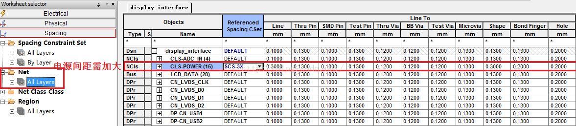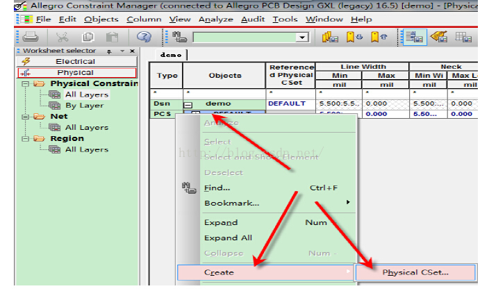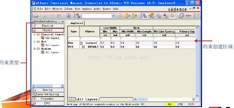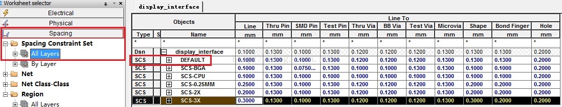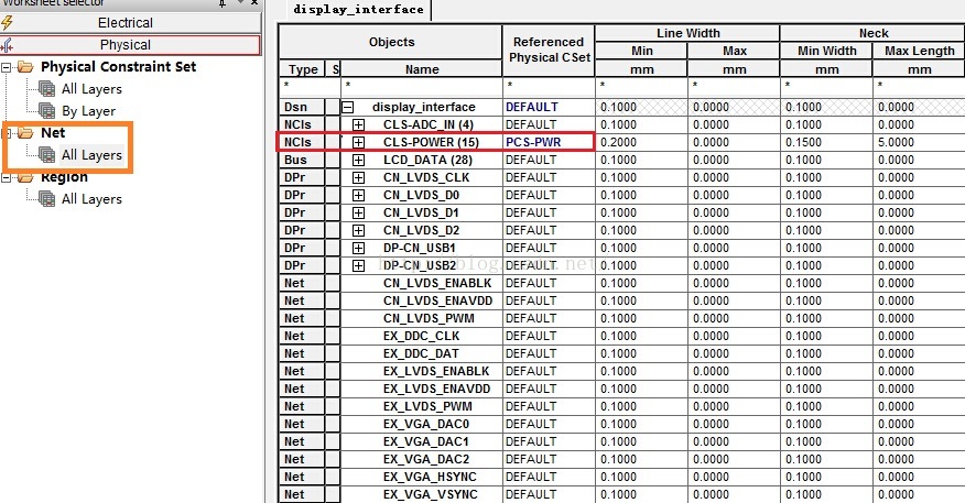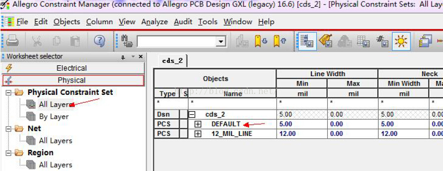 点选Physical Constraint Set 即可出现Default 的Physical 相关设定值,如Line Width线宽、Neck width..、过孔等(对于BGA封装元件,需要使用Region区域约束规则设置)。 Physical物理规则可以使用Defaul约束t规则,也可以新建约束规则。