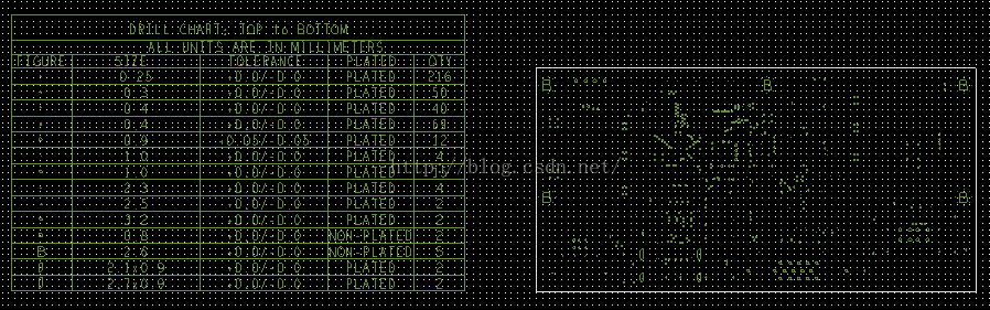 5)单击ok按键,生成钻孔表并附在光标上。在电路板外框内 自动生成钻孔图,同时显示钻孔表。详见下图2.7.4。