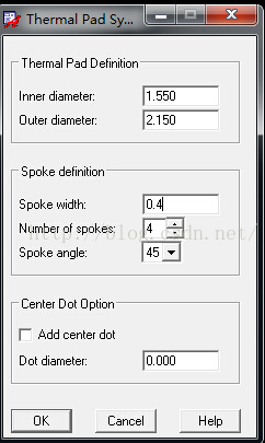 Ø BEGIN LAYER :定义焊盘在PCB板中的起始层,一般指TOP层 Ø DEFAULT INTERNAL :定义焊盘在PCB板中处于顶层和底层之间的各层(可能是电源层、地层、信号层)。 Ø END LAYER:定义焊盘在PCB板中的结束层,一般指Bottom层 Ø SOLDERMASK_TOP和SOLDERMASK_BOTTOM分别表示顶层阻焊层和底层阻焊层。 Ø PASTEMASK_TOP和PASTEMASK_BOTTOM分别表示顶层助焊层和底层助焊层。 注: 焊盘参数设定的推荐值 1、过孔径与正规焊盘的外径关系:焊盘的外径 = 过孔径 +0.6mm 2、热风焊盘与正规焊盘的外径关系:热风焊盘的外径=正规焊盘外径 + 0.5mm;热风焊盘的内径= 正规焊盘外径; 开口宽度= 0.4mm(经验值) 还有一种理解:开口宽度=DRILL SIZE × Sin30° ,同时开口宽度,则要根据圆周率计算一下,保证连接处的宽度不小于10mil(0.254mm),例如过孔径0.9mm,则开口宽度= 0.9mm x 0.5 =0.45mm 3、隔离焊盘与正规焊盘的外径关系:隔离焊盘的外径=正规焊盘外径 + 0.5mm 3、阻焊层外径与正规焊盘的外径关系: 阻焊层外径 =正规焊盘外径 + 0.1mm 4、加焊层外径与焊盘的外径关系: 加焊层外径 =正规焊盘外径