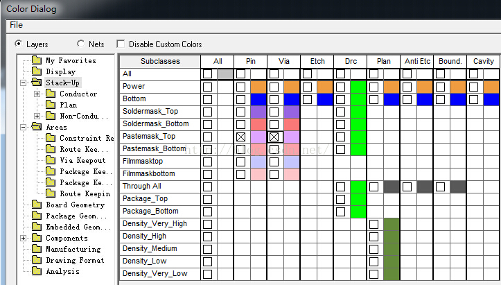 第二步:设置各层颜色。一般只显示 top bottom GND POWER silk丝印层 ,其他根据需要显示。通过查看gerber输出文件是否和 按设计输出PCB文件。