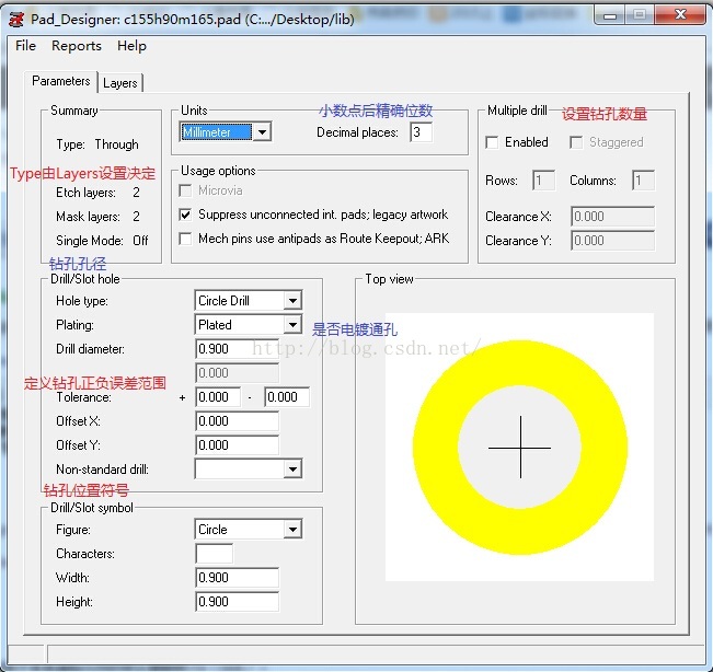 圆形焊盘:c焊盘外径h过孔径m阻焊层圆形外径, 例如:c300h140m310表示 焊盘外径:3.00mm,过孔径:1.40mm,阻焊层外径:3.10mm