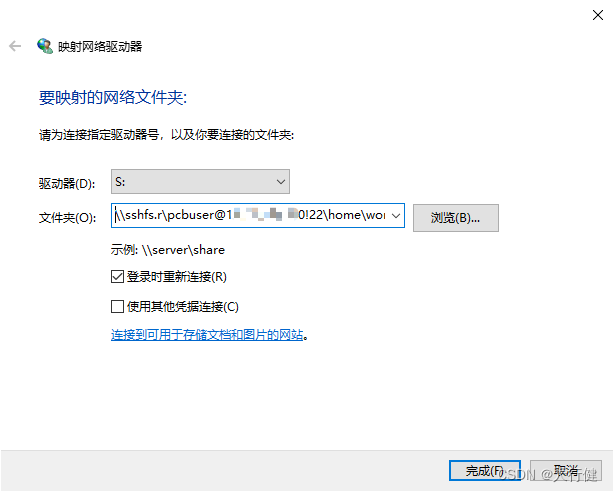 2.之后选择驱动器,我选择是S,文件夹输入:\\sshfs.r\pcbuser@xxx.xxx.xxx.xxx!22\home\worker\cadence