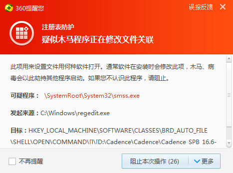杀毒软件会提示报错,更多下面选择允许本次操作即可,因为是你手动修改注册表,所以安全类软件会误认为是木马所为