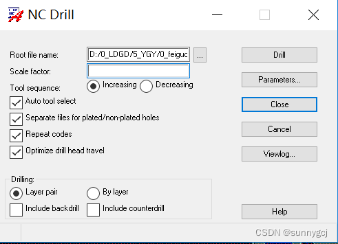 选择生成钻孔文件(Drill)或则钻槽文件(Route),由于这个项目只有孔没有槽,所以只生成钻孔文件即可,文件格式为.drl