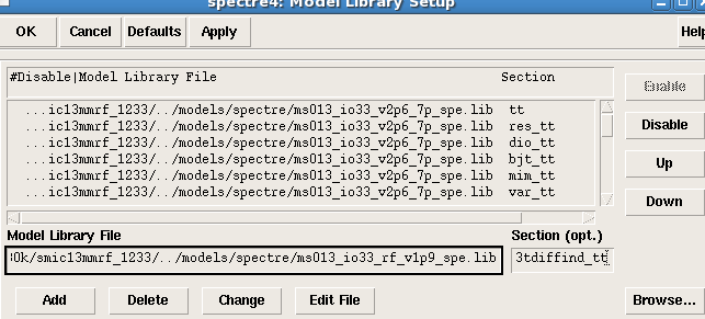 将原来错误的model library删除,browse找到正确的工艺库下的.lib文件添加,section设置为tt,OK
