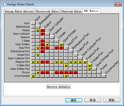 不同属性的管脚相连是不报错,报警告还是报错误的矩阵设置,在进行电气仿真时可能会用到。