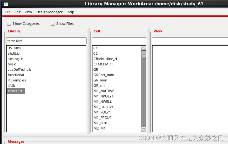 创建第一个工程之前,先确保前面的部分已经正确完成,在库管理器能够找到tsmc18的库,如下图所示: