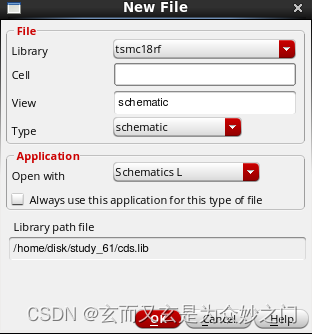 Cell 栏填写文件名(例如inv01),type用于选择创建的文件类型,schematic是原理图, layout 为版图。一般情况下都是先创建原理图,再依据原理图绘制版图
