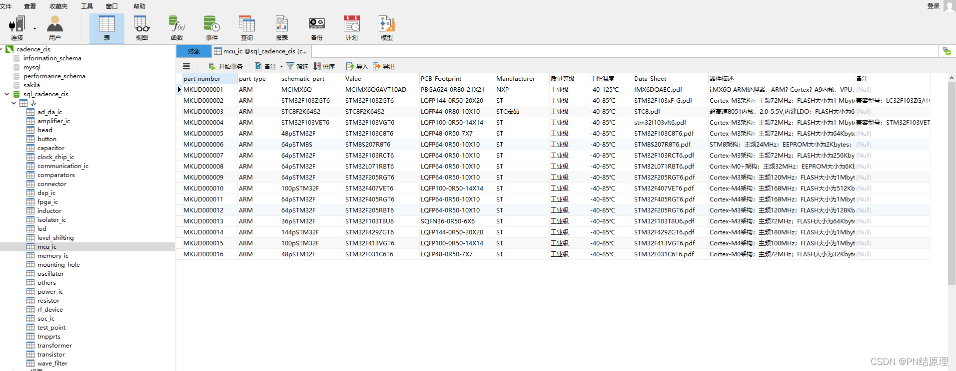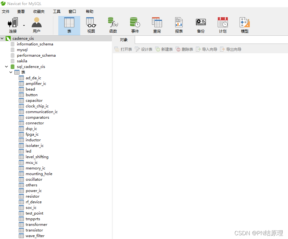 2.4 连接成功后入下图。依次建立新建数据库,如sql_cadence_cis;然后可直接导入提前整理好的.csv文件产生器件种 类 表。