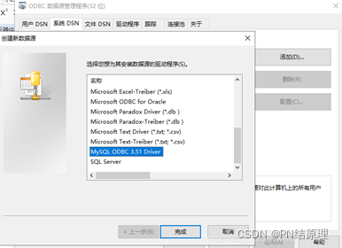 3.3 切换到系统DSN,选择“添加”,选择MySQL ODBC 3.51 Driver,点击完成: