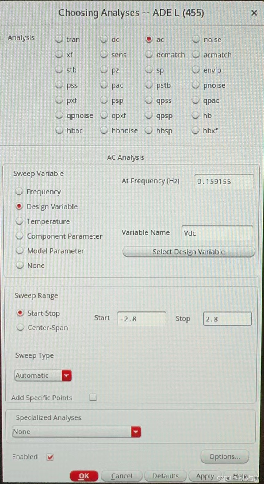 2、选择分析器,AC仿真,固定频率,选择扫描变量
