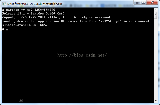 2.在 命令行 内输入partgen -v xc7k325t-fbg676(将最后这个型号替换为你的芯片型号)