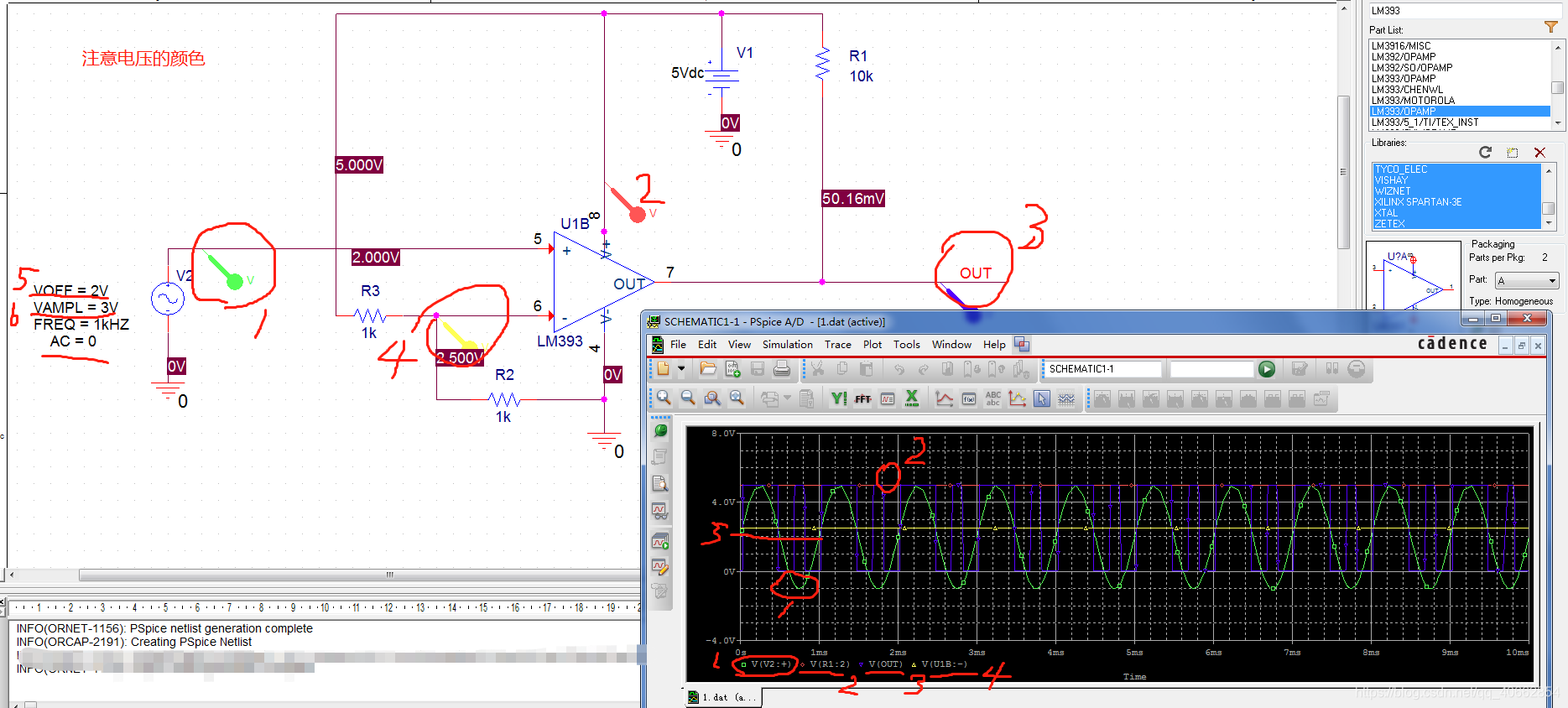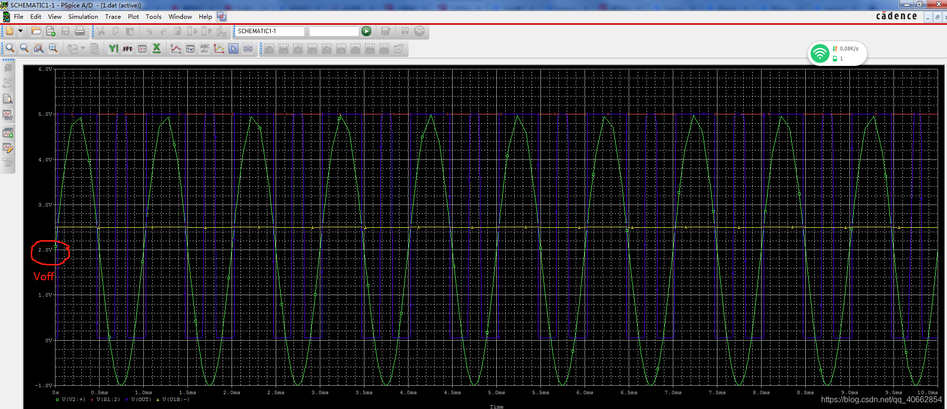 我们来看看仿真结果:输入为正弦波(峰峰值5V,直流分量2.5V),当正弦波(绿线)>2.5V时,输出(红线)为高电平;当正弦波(绿线)< 2.5V时,输出(红线)为50mV->0V为低电平,这50mV是由于运放本身造成的,对输出电平判别而言值可以忽略。