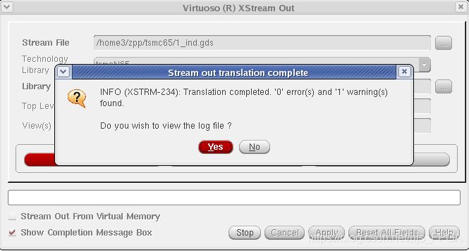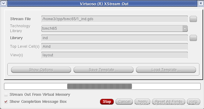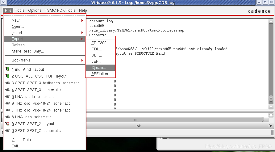 导出GDS2。选择主窗口的菜单【File】→【Export】→【Stream...】,会打开 Stream Out的窗口。