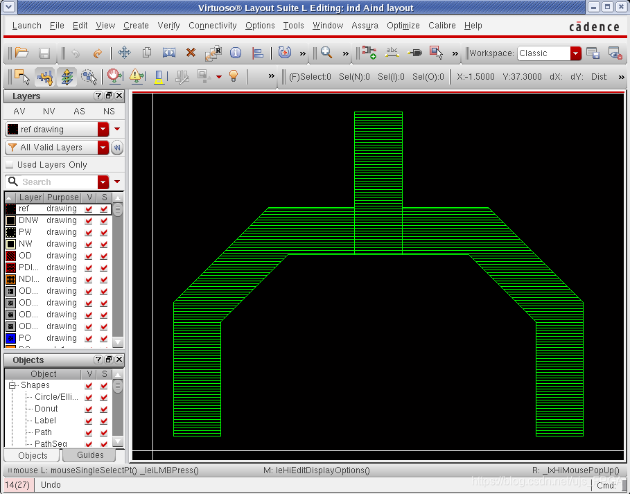首先进入cadence版图界面这是电感的版图,这就是我们要导入到ADS的版图。关闭layout。