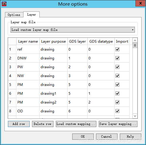 点击【Options...】,点击【Layer map file】,选择【Load custom layer map file】,选择tsmcN65.layermap文件。