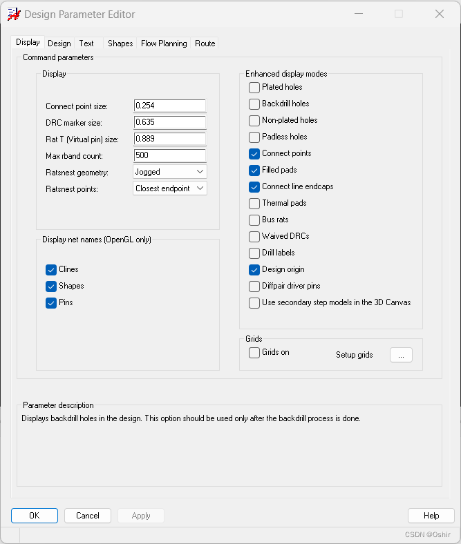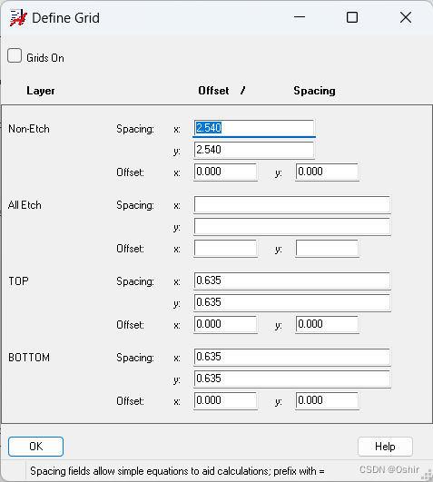 由于一般做元件封装,栅格点之间的距离不需要太大,且作图时可以选择坐标画图,不需要用鼠标抓取,所以在Non-Etch非电气层修改间距Spacing x为0.01,y为0.01,Etch电气层添加间距Spacing x为0.01,y为0.01即可。点击OK,返回Design Parameter Editor对话框。