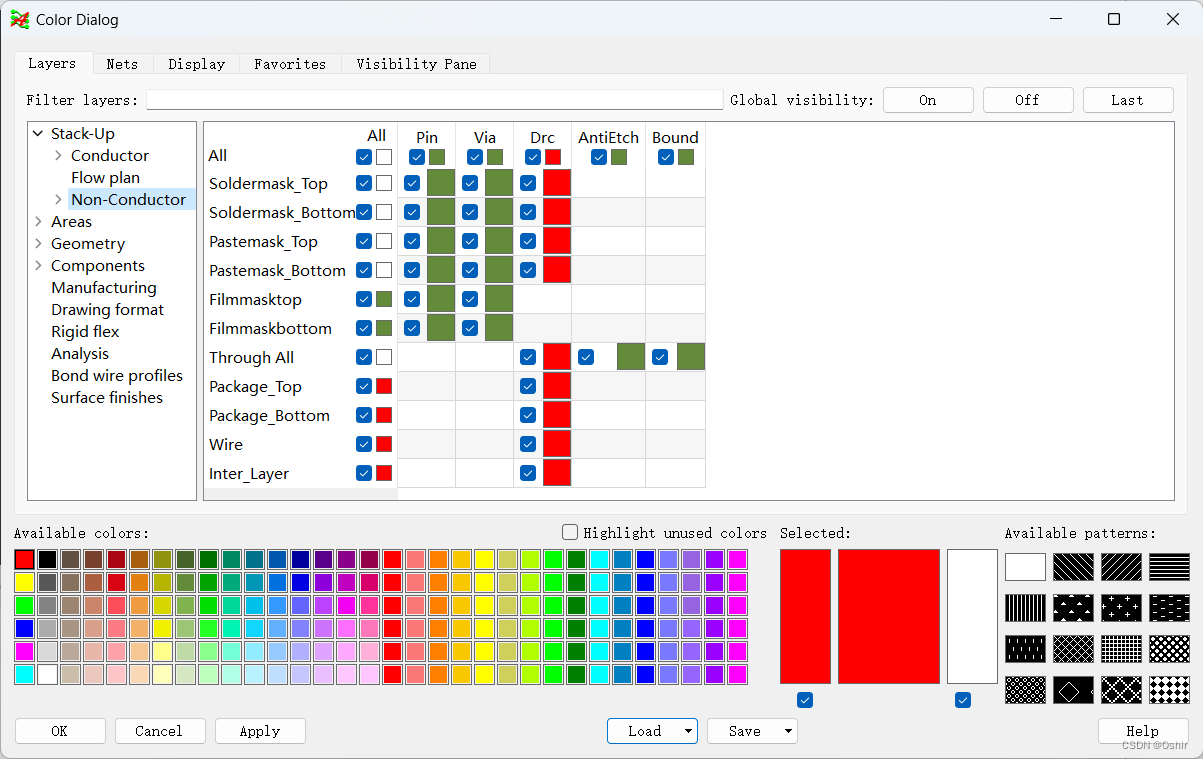 点击Stack-Up层叠下拉图标,选中Non-Conductor,由于这个非导电层在作图过程中是不需要查看的,所以需要点击x:All-y:All的√,即取消所有图层显示颜色,然后点击x:All-y:Drc的框打上√,即选择在Drc设计检查的时候显示即可。