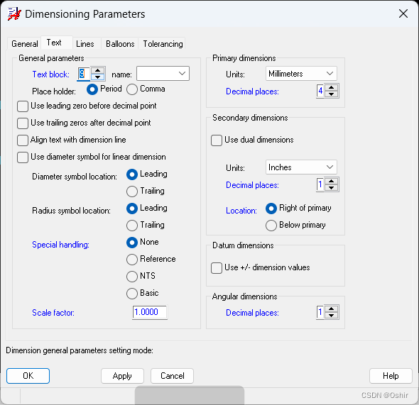 弹出对话框Dimensioning Parameters,选择Text文本设置,如下图;