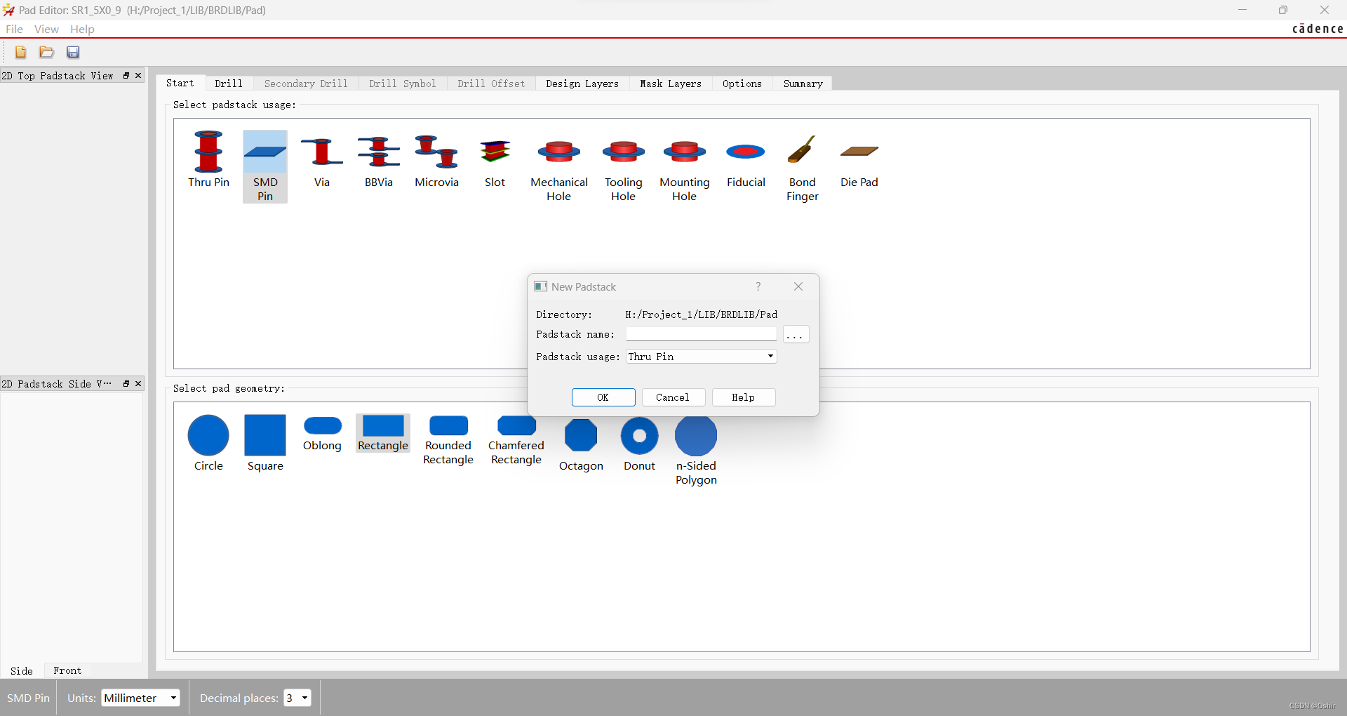关于Padstack Editor(Allegro),这个软件使用起来非常简单,只需设置存放的路径和尺寸单位即可。如下图,在画焊盘之前,先建立新的焊盘文件。