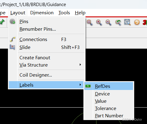 按照上面步骤添加文本,选择Layout->Labels->RefDes,如下图;