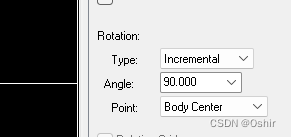 在右侧Options,Rotation:Type:选择Incremental,即递增模式,Angle:90,角度是90°,Point:Body Center,即移动物体的中心是字体的中心,如下图。
