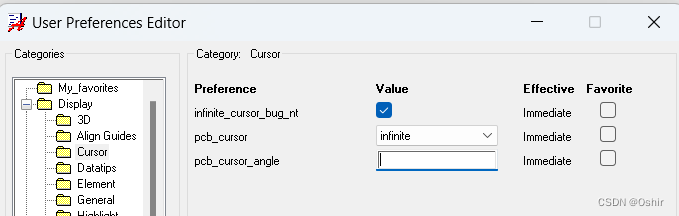 3.11.1 修改光标,点击Display的"+"号,展开点击Cursor,设置光标为全屏,如下图,将infinite_cursor_bug_nt的框打√,并点击pcb_cursor下拉选择infinite,意思为光标为无穷大,即为全屏光标,方便测量尺寸时对齐,如下图;