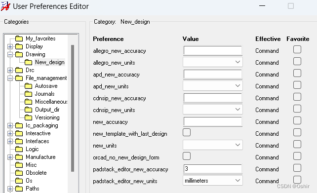 3.11.2 修改焊盘精度,点击Drawing的"+"展开,点击New_Design,选择padstack_editor_new_accuracy为3,padstack_editor_new_units为millimeters,为毫米。如下图。