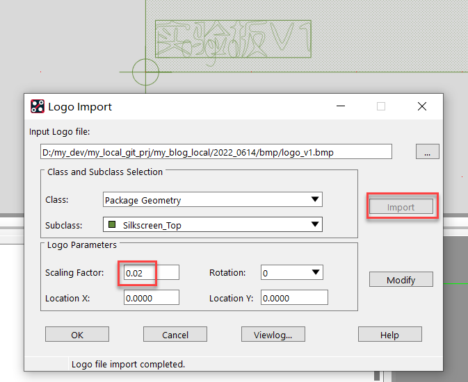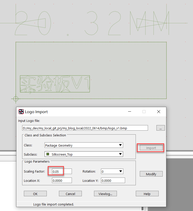 等Allegro导入图片时, 就差一点(比实际画出的参考防止框稍微大点), 调整一下比例(从1调整为0.8左右), 然后调整xy位置, 就可以将Logo落到预估的方框位置。但是看到中文字体中间有3个英文字符090, 一会试试能不能删掉。点击确定后, 退出导入Logo的对话框: