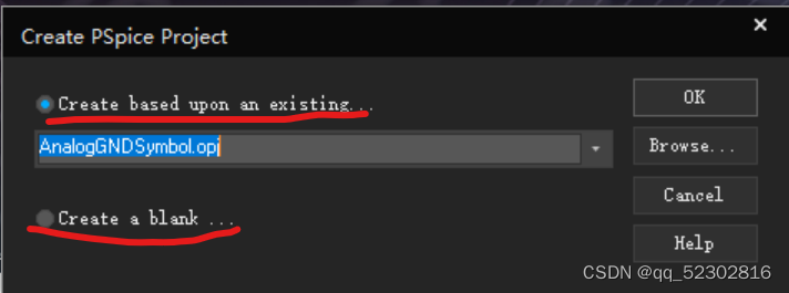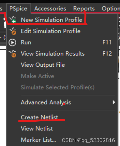 Step 4: 点窗口上方Pspice按钮,创建网表(Create Netlist),主要是为了之后便于分析电阻的电流方向,再点击New Simulation Profile,选择采用什么方法仿真,即可开始仿真。