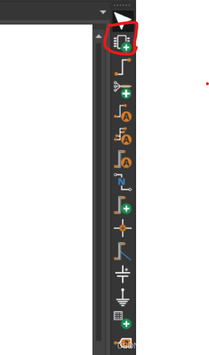 Step 3:在打开的原理图界面,放置器件,放置器件有两种方法,一是按Place->Part,一是按窗口右边的如下图按钮,即可添加器件,第一次使用软件,得添加库,点击Libraries旁边的绿色加号按钮,在capture/library/Pspice添加所需的库,添加完,可通过Par搜索所用器件,选中Part中对应的器件,点击Par右边的放置按钮,即可拖动器件到原理图,连接线,也是两种办法,一种Place-> Wire ,一种点击窗口右边图标。