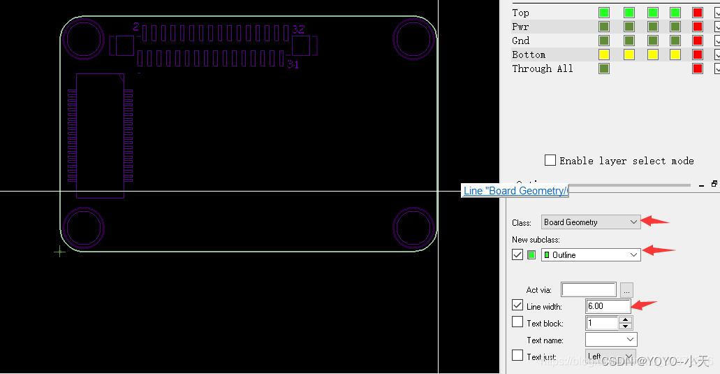 换层算是老生常谈的手法了,使用的是allegro的change命令。在点击change命令后在右下角的参数选单里选择新的子层boardgeometry->outline,宽度设置为6mil方便观察,然后左键单击dxf层内容的外边框就行了,会发现外边框的颜色变成了绿色,也就是outline层的颜色,说明外边框已经成功导入到了pcb文件中。