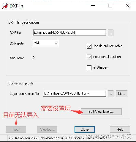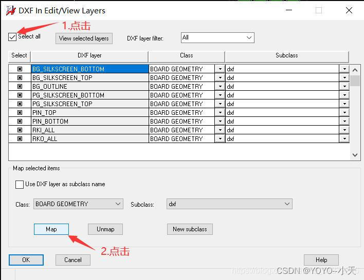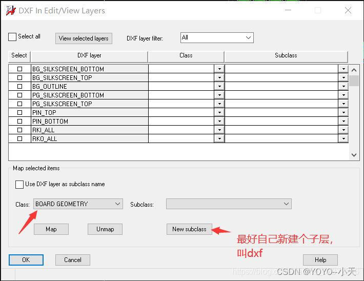 设置完上面的内容是暂时不能导入的。因为cadence allegro中使用层(class)来管理内容,导入dxf文件不可能凭空放进去,需要给它安排合适的层。