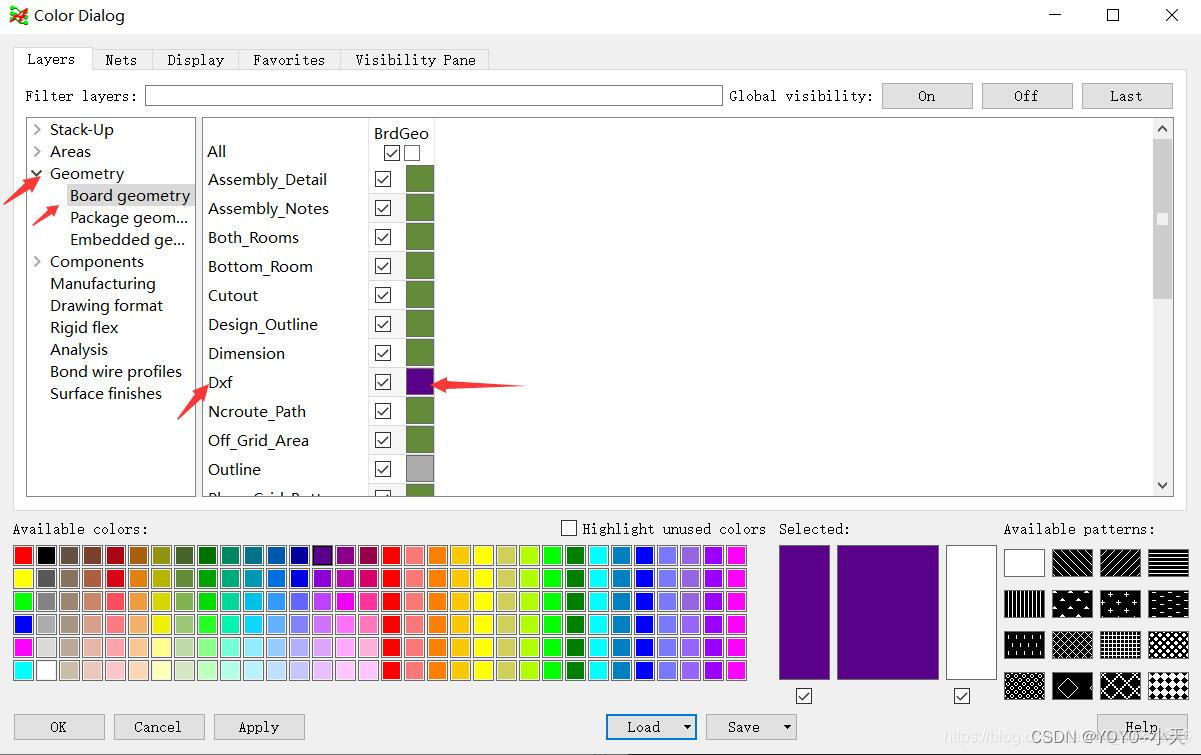 导入成功后,点击工具栏里的颜色管理器,找到刚才新建的层:geometry->board geometry->dxf。确定其是显示状态(后面有对勾),可以为其赋予一个比较鲜艳的颜色。
