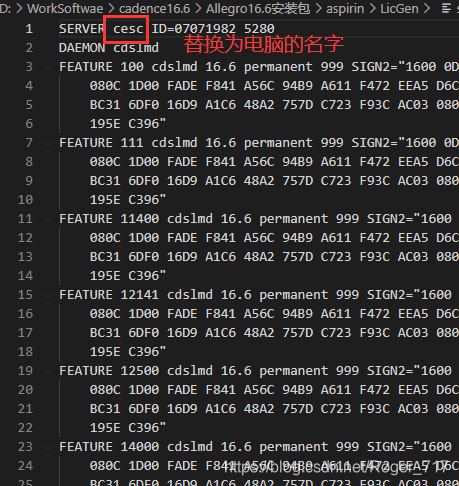 找到scr.lic文件用VS Code打开,将cesc更改为计算机全名,保存退出