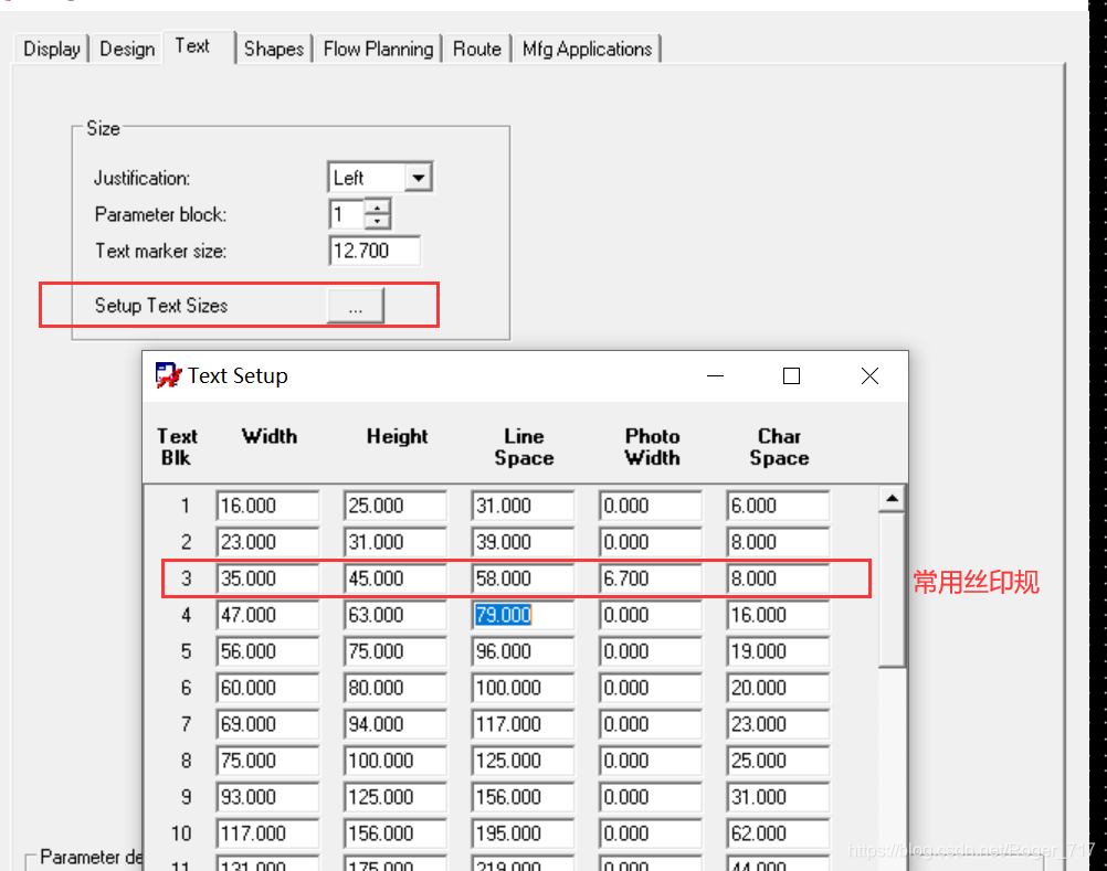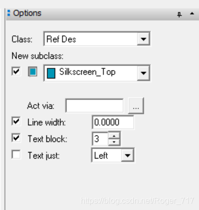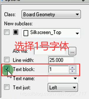 菜单栏选择Edit-->Change,右侧弹出Options选项,选择Class : New subclass = Ref Des : Silkscreen_Top,设置Text block,后面的数字代表字号的大小,如下图。