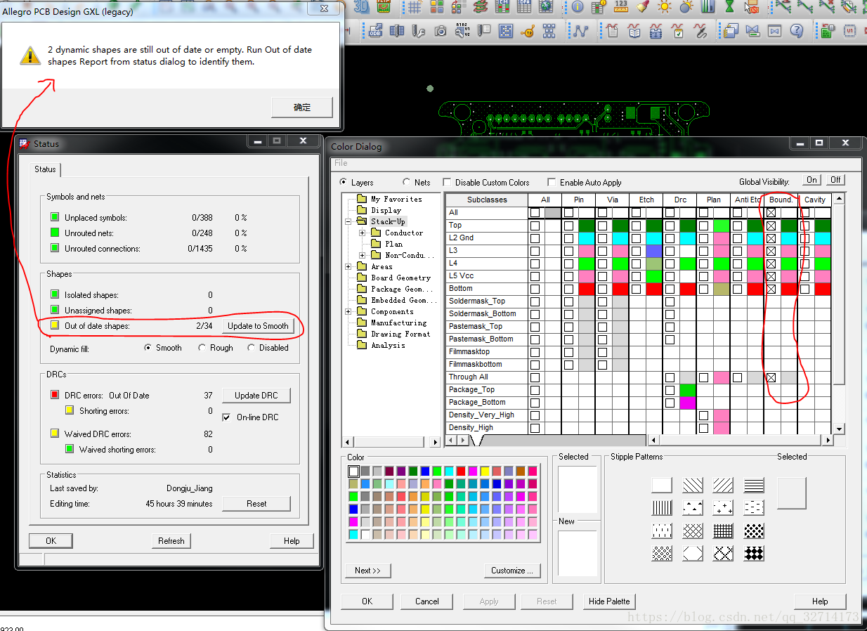 点击out of data shape前面那个小框,会出现对应没删除铜皮的坐标,点击坐标即可跳转到相应的铜皮,删除即可。